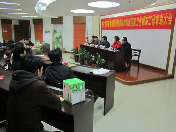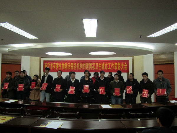 2012年3月8日,由南寧市愛衛(wèi)辦組織在市衛(wèi)生局隆重舉行了“南寧市有害生物防治服務(wù)機(jī)構(gòu)創(chuàng)建國家衛(wèi)生城市工作表彰大會(huì)”,南寧市康凈衛(wèi)生消毒殺蟲有限責(zé)任公司在首府南寧市創(chuàng)建國家衛(wèi)生城市工作中,成績突出,被評(píng)為先進(jìn)單位以及本公司馮東等6名員工被評(píng)為先進(jìn)個(gè)人,圖為李作慶副主任主持會(huì)議及頒發(fā)證書現(xiàn)場。